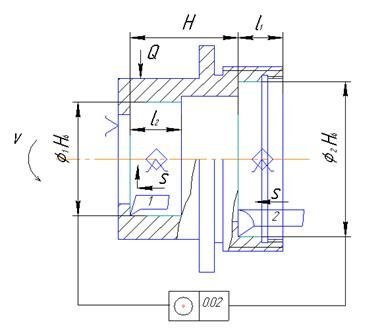 Деталь базируется и закрепляется в самоцентрирующее устройство по наружной черной базе. При обработке резцом 1 плечико обрабатывается при поперечной подаче. Это сложнее, но зато точнее. Можно обеспечить биение плечика до 0,01 мм. Резцом 2 плечико получают режущей кромкой, установленной перпендикулярно оси вращения. Точность меньше, но зато проще операция, не надо отводить резец. Размер Н, как внутрикомплексный, выдерживается за счет настройки станка.