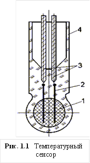Для измерения температуры – её первичного восприятия – можно использовать сенсор (рис.1.1) в виде полупроводникового терморезистора, у которого чувствительный элемент 1 выполнен в виде шарика диаметром 0,5 мм из германия и защищен стеклянной оболочкой 4. В шарик вмонтированы платиновые электроды 2, соединенные с выводами 3.