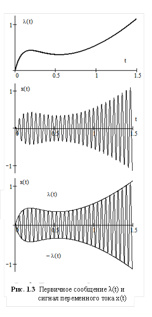 - нижний график иллюстрирует тот же выходной сигнал, но только на графике изображены и две огибающие, - линии, которые скользят по вершинам измерительного сигнала и повторяют изменение во времени самого первичного сообщения.