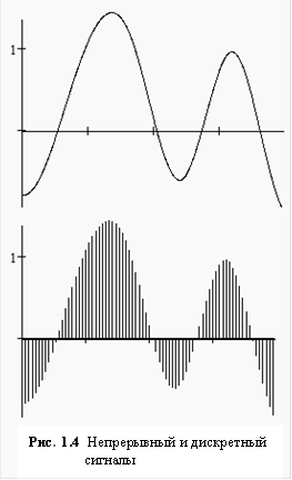 На рис.1.3 вверху изображен исходный непрерывный сигнал, а внизу тот же сигнал, но представленный уже в форме дискретного сигнала. Дискретный сигнал представляет собой последовательность отдельных отчетов непрерывного сигнала, взятых через определенные промежутки времени, называемые шагами дискретизации, и округленных до целого числа некоторых единиц измерения уровня сигнала, которые называются шагами квантования сигнала.