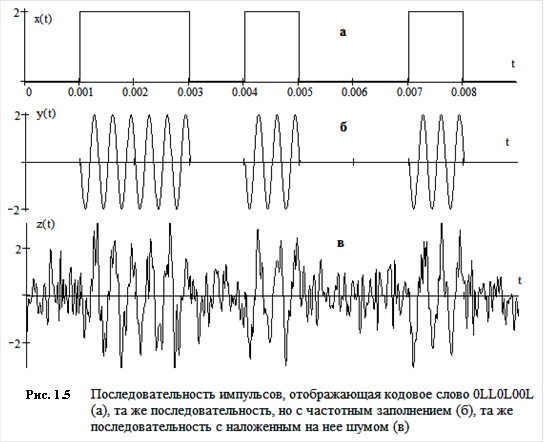 Но импульсы постоянного тока на пути передачи их по каналам связи подвергаются сильному влиянию помех. Поэтому их приходится предварительно подвергнуть, например, частотной модуляции, в результате чего импульсы заполняются высокочастотными колебаниями (средний график на рис. 1.5).