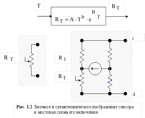 (рис. 1.2). Но первичное сообщение еще не является измерительным сигналом. Для преобразования первичного сообщения в сигнал следует составить электронную схему с участием сенсора как переменного резистора, которая обеспечивала бы получение напряжения, зависящего от сопротивления этого резистора, то есть, в конечном итоге, от измеряемой температуры. Для этого можно использовать мостовую схему (рис. 1.2), в одно из плеч которого и включается терморезистор