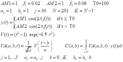 - базисные функции sinωt и cosωt, зависящие от одного параметра – частоты ω, заменяются на вейвлет V(a,b,t), функцию, зависящую от двух параметров a и b.