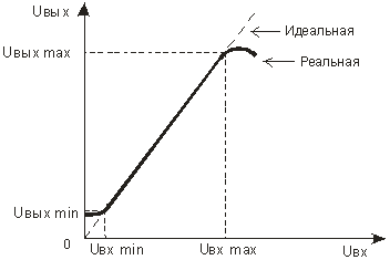Рис. 1 Амплитудная характеристика реального и идеального усилителя