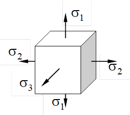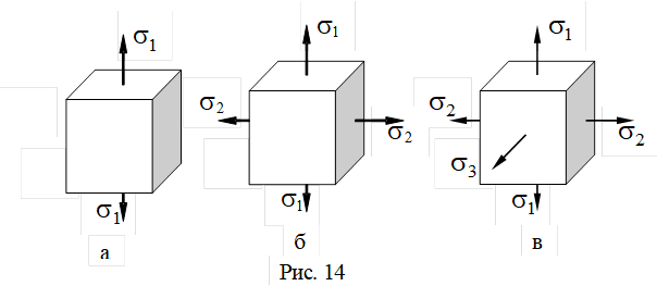 Объемное напряженное состояние. Объемным или трехосным называется напряженное состояние, при котором все три главных напряжения отличны от нуля (рис. 14,в). Для объемного напряженного состояния справедливо равенство