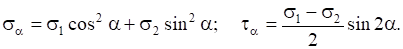 , отличающиеся на 900. Таким образом, данная формула определяет две взаимно перпендикулярные площадки, на которых нормальные напряжения принимают экстремальные значения. Учитывая, что сумма нормальных напряжений по двум взаимно перпендикулярным площадкам постоянна, то на одной площадке будет действовать максимальное нормальное напряжения, а по другой – минимальное.