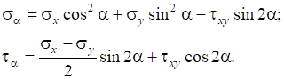 Обратная задача. Определим сначала напряжения на наклонной площадке, наклоненной к исходной, при заданных напряжения на двух взаимно произвольных перпендикулярных площадках sx , sy , tyx и txy (рис. 16,б).