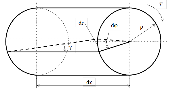 Напряжения и деформации при кручении бруса. Под действием внешнего скручивающего момента, приложенного на правом конце бруса, левый конец которого жестко закреплен, брус будет закручиваться. Выделим из бруса элементарный цилиндр длиной