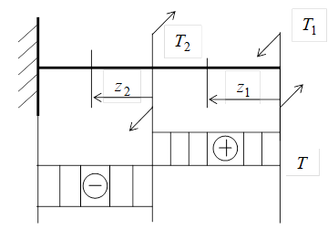 В каждом сечении определяется крутящий момент, а затем строится эпюра крутящих моментов. Для случая, изображенного на рис. 20, крутящие моменты в сечениях 1 и 2 будут равны
