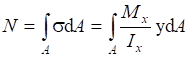 Нейтральная линия. Положение нейтральной линии определим из условия равенства нулю нормальной силы в сечениях балки при чистом изгибе