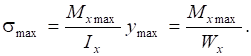 Максимальные нормальные напряжения при изгибе возникают в сечениях, где действует максимальный изгибающий момент, в точках сечения наиболее удаленных от нейтральной оси