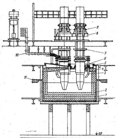 Электрододержатель с электродами смонтирован на расположенной независимо от печной ванны шахте. Печь оборудована механизмами наклона и поворота ванны. Выделяемые из печи газы удаляют через вытяжной короб (не показанный на рисунке), закрывающий рабочее пространство по всему объему. Через вытяжной короб пропущены загрузочные лотки, которые могут перемещаться вручную для направления шихтовых материалов в определенную точку ванны. Перепуск электродов — дистанционный, пружинно-пневматический. Электрический режим поддерживается автоматически регулятором мощности, осуществляющим регулирование по сопротивлению. Короткая сеть печи состоит из шинного пакета, подсоединяемого к электропечному трансформатору, гибких кабелей и токоведущих труб электрододержателя. Футеровка печи выполнена магнезитовым кирпичом. Печь оборудована гидравлическими цилиндрами для наклона ванны в сторону сливного носка на 40° и рабочего окна на 15°. Перемещение электродов в вертикальной плоскости производят механизмом перемещения, состоящим из двигателей постоянного тока с редукторами и системой управления двигателями и тросовой (или реечной) передачей, обеспечивающей поступательное движение электрододержателя с электродами.