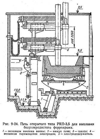 Печи периодического действия (с открытой дугой). Характерным представителем печей этого типа является рафинировочная печь РКО-3,5 (рис. 9-24), предназначенная для выплавки безуглеродистого феррохрома, малоуглеродистого ферромарганца, рудоизвесткового расплава, металлического марганца и ферровольфрама периодическим процессом.