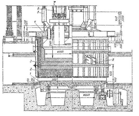 Кожух печи через двухтавровые балки опирается на железобетонную плиту, жестко связанную с механизмом вращения печи, который используется преимущественно при малошлаковых процессах для повышения газопроницаемости ванны, общего КПД и электрического сопротивления. Свод печи — металлический водоохлаждаемый и состоит из шести секций, внутренняя поверхность которых покрыта слоем жаропрочного бетона толщиной 20—50 мм. Охлаждение свода, короткой сети я других элементов конструкции осуществляют от сборного коллектора. Ванна печи футерована асбестом, диатомитовой засыпкой, шамотным кирпичом и угольными блоками в зоне расположения расплава. Электрододержатель имеет восемь контактных щек, прижим которых осуществляют пружинами, а отжим — давлением масла. Перемещение электродов производят гидроподъемниками, состоящими из трех вертикальных плунжеров, траверсы и уплотнения. Питание гидроподъемников и прижимных устройств осуществляют от насосно-аккумуляторной станции. Устройство для перепуска электродов — дистанционное, пружинно-гидравлическое. Для выпуска сплава печь РКЗ-16,5 имеется механизм прожига летки, питаемый от одной из фаз короткой сети. Для отбора печных газов на своде печи установлены рабочий и резервные стаканы газоходов, веющие песочные уплотнения отверстий в своде.