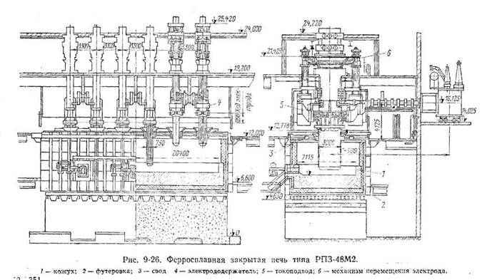 Ферросплавная электропечь типа РПЗ-48 (рис. 9-26) предназначена для выплавки силикомарганца различных марок и оборудован печными трансформаторами мощностью 3X21000 кВ-А. Электропечь имеет прямоугольный кожух с футеровкой, выполненной из угольных блоков, шамотного и магнезитового кирпича, а также компенсационного слоя из молотого шамота. Прожиг каждой из трех сливных леток, расположенных в линию по боковой поверхности кожуха, осуществляют от установок, электрически связанных с одной из фаз печи. Свод печи выполнен плоским водоохлаждаемым с обмазкой внутренней поверхности огнеупорным бетоном.
