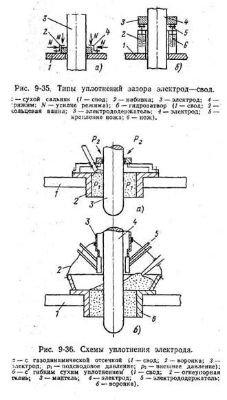 В случае высокотемпературных процессов (выплавка ферросплавов, кристаллического кремния) рекомендуется водоохлаждаемый свод консольного типа. Для процессов с температурой под сводом до 1000°С (возгонка фосфора, выплавка медно-никелевых штейнов и др.) рекомендуется распорный неводоохлаждаемый свод. При выплавке продуктов с химически активными элементами при температуре под сводом 600—1000°C целесообразна установка водоохлаждаемой вставки в центре свода распорного типа в зоне его максимального износа. Для герметичных печей наибольшее применение получили уплотнения зазора между электродом и сводом, показанные на рис. 9-35 и 9-36.