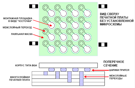 Печатная плата для корпуса BGA (выводы в виде матрицы шариков) показана на рис 4.15. Обратите внимание, что все связи с шариками должны быть сделаны при помощи межслойных переходов к другим слоям платы. Для таких блоков часто всего используется структура дорожки в виде "кости". Затененная зона показывает положение паяльной маски. Также как в случае с блоком PQFP, локальные развязывающие конденсаторы должны быть расположены как можно ближе к блоку с короткими связями с выводами VDD и прямыми связями через межслойные переходы к слою заземляющей поверхности.