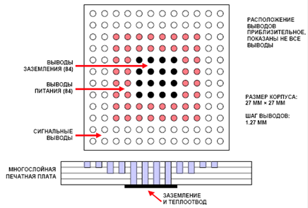 Расположенные в центре шарики заземления выполняют двойную функцию. Их первая функция обеспечивать низкоимпедансную связь со слоем заземляющей поверхности. Вторая функция – отводить от корпуса тепло на заземляющую поверхность, т.е. служить теплоотводом, т.к. устройство должно рассеивать при работе в среднем около 2,5 Вт. Добавление внешнего теплоотвода, как показано, понижает еще больше температурное сопротивление переход-среда.