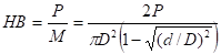 При D=10 мм, Р= 29400 Н (Р/D2 =294 МПа) и времени выдержки под нагрузкой 10 с твердость по Бринеллю обозначается символом НВ с указанием числа твердости. При этом размерность (МПа) не ставиться, например 200НВ. При использовании шариков других диаметров (1, 2, 2,5 и 5 мм) изменяется нагрузка вдавливания, а символ твердости НВ дополняется тремя индексами. Например 180НВ2,5/187,5/30 обозначает что при D= 2,5 мм, Р=187,5 кгс (1839Н) и времени выдержки под нагрузкой 30 с число твердости по Бринеллю равно 180.