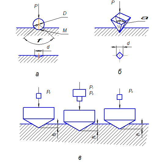 При испытании на твердость по методу Бринелля (ГОСТ 9012-59) в поверхность материала вдавливается твердосплавный шарик диаметром D под действием нагрузки Р и после снятия нагрузки измеряется диаметр отпечатка d (рис.2.3,а). Число твердости по Бринеллю (НВ) подсчитывается как отношение нагрузки Р к площади поверхности сферического отпечатка М: