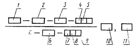 1-тип; 2- марка; 3-диаметр, мм; 4-обозначение назначения электродов; 5-обозначение толщины покрытия; 6-группа индексов; указывающих характеристики наплавленного металла и металла шва по ГОСТ 9467-75, ГОСТ 10051-75 или ГОСТ 10052-75; 7-обозначение вида покрытия; 8-обозначение допустимых пространственных положений сварки или наплавки; 9-обозначение рода применяемого при сварке или наплавке тока, полярности постоянного тока и номинального напряжения холостого хода источника питания сварочной дуги переменного тока частотой 50 Гц; 10-обозначение настоящего стандарта; 11-обозначение стандарта на типы электродов