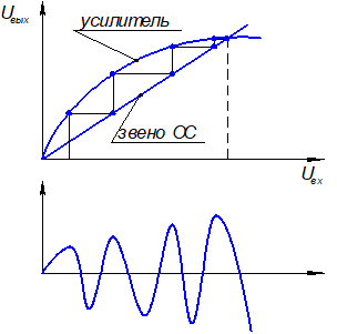 Амплитуда колебаний при возбуждении будет расти до тех пор, пока из-за нелинейности амплитудной характеристики, коэффициент усиления не уменьшится и выполнится точный баланс амплитуд.