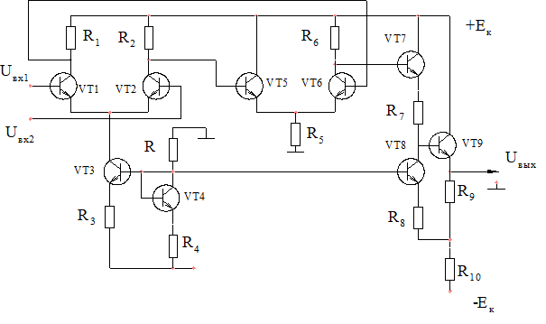 Дифференциальный усилитель, но не симметричный. Выходной каскад (аконечный) – схема с ОК, делитель сигнала выполнен на ктивных элементах, все это работает как составной транзистор.