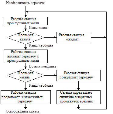 Все сетевые интерфейсные платы запрограммированы на разные псевдослучайные промежутки времени. Если конфликт возникнет во время повторной передачи сообщения, этот промежуток времени будет увеличен. Стандарт типа Ethernet определяет сеть с конкуренцией, в которой несколько рабочих станций должны конкурировать друг с другом за право доступа к сети.