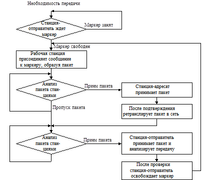 Пакет распространяется по ЛВС от адаптера к адаптеру, пока не найдет своего адресата, который установит в нем определенные биты для подтверждения того, что данные достигли адресата, и ретранслирует его вновь в ЛВС. После чего пакет возвращается в узел из которого был отправлен. Здесь после проверки безошибочной передачи пакета, узел освобождает ЛВС, выпуская новый маркер. Таким образом, в ЛВС с передачей маркера невозможны коллизии (конфликты). Метод с передачей маркера в основном используется в кольцевой топологии.