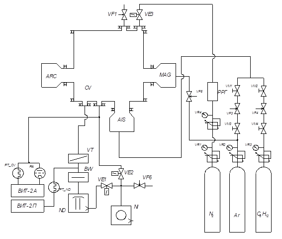 Рис. 1 Вакуумная схема установки типа ВУП (ARC – дуговой источник, MAG – магнетрон, AIS – автономный источник ионов)