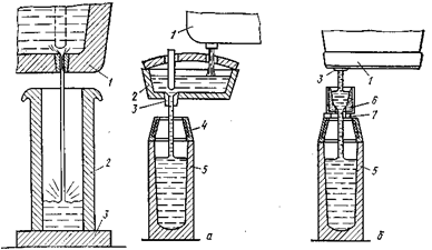 Схема разливки стали сверху, через промежуточный ковш (а) и промежуточную воронку (б)