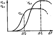 Зависимость линейной скорости кристаллизации Vл к и скорости образования зародышей Vо.з. от величины переохлаждения