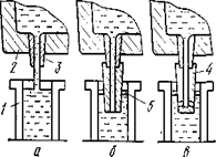 Металл в кристаллизатор подают либо открытой струей (рис, а), либо «под уровень» с помощью удлиненных составных стаканов, конец которых погружен в металл на глубину 50—100 мм (рис.). Подачу «под уровень» осуществляют вертикальной (рис., б), либо горизонтальными или наклонными струями (рис., в). Разливка под уровень предотвращает окисление и разбрызгивание струи металла и уменьшает его охлаждение, снижает пораженность слитка поверхностными продольными трещинами. Подачу вертикальными струями применяют при отливке слитков, близких по сечению к кругу или квадрату; подачу через погружаемые стаканы с боковыми отверстиями — для плоских слитков.