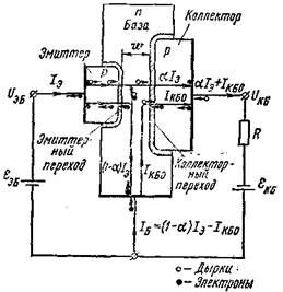 Толщина базы w в транзисторе значительно меньше диффузионной длины дырок, благодаря этому основная часть дырок, инжектируемых эмиттером, пролетает сквозь базу до коллекторного перехода. Здесь дырки увлекаются полем коллекторного перехода, включенного в обратном направлении, и создают в его цепи ток, величина которого пропорциональна эмиттерному току Iэ: