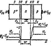Если же на коллектор подать прямое напряжение, то возникает инжекция носителей заряда из коллектора в базу, концентрация дырок в базе значительно возрастает, а градиент концентрации уменьшается (кривая 3). В этом режиме влияние коллекторного напряжения на градиент концентрации дырок в базе и ток эмиттера такое же, как и влияние эмиттерного напряжения.