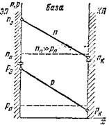 Концентрация основных носителей заряда. Отметим прежде всего, что инжекция дырок из эмиттера в базу обязательно сопровождается одновременным поступлением в базу из внешней цепи через ее вывод такого количества электронов, которое обеспечивает сохранение электрической нейтральности