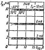 Схема с общей базой. На рис. 3.20 показаны выходные характеристики германиевого транзистора, снятые при трех различных температурах. Аналогично выглядят характеристики кремниевого тран