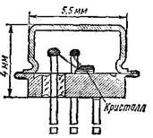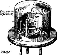 В результате образуются эмиттерная область с электропроводностью n+ -типа и эмиттерный переход (рис. 3.7, г), который при этом также покрывается снаружи защитной пленкой окисла (на рисунке не показано). Остается вскрыть окна для алюминиевых электродов базы и эмиттера, нанести эти электроды (рис. 3.7,д) и транзисторные структуры готовы. После резки пластинки на отдельные элементы, содержащие по одной транзисторной структуре, каждый элемент, называемый кристаллом, впаивают коллектором на дно ножки стандартного корпуса, эмиттерный и базовый контакты присоединяют тонкими проводниками к соответствующим траверсам ножки. Собранную ножку в осушенной атмосфере закрывают металлическим колпачком и герметизируют (рис. 3.8). Выпускаются также бескорпусные транзисторы, у которых климатическая защита осуществляется с Рис. 4.8