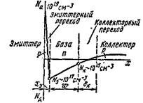 При изготовлении транзисторов диффузионным методом концентрация примеси в базе получается более высокой у эмиттера, что снижает омическое сопротивление базы гб, и более низкой у коллекторного перехода, что уменьшает его емкость; одновременно повышается пробивное напряжение коллектора.