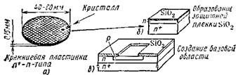 (рис. 3.7,a), после химической очистки и промывки помещают в атмосферу влажного кислорода, где она при высокой температуре покрывается тонкой и плотной пленкой двуокиси кремния SiO2, эффективно защищающей поверхность кремния от воздействия внешней среды и проникновения примесей (рис. 3.7, б). Затем в пленке окисла методом фотолитографии вытравливают окна (рис. 3.7, в) и пластинку подвергают воздействию паров борной кислоты. Бор диффундирует в кремний в каждом окне на глубину в несколько микрометров, создавая слой с электропроводностью р–типа – базу будущей транзисторной структуры. Наружная поверхность р-слоя при этом вновь покрывается защитной пленкой двуокиси кремния. так же как и выход образовавшегося на границе р- и n-областей р-n-перехода (на рисунке не показано). Далее в пленке окисла