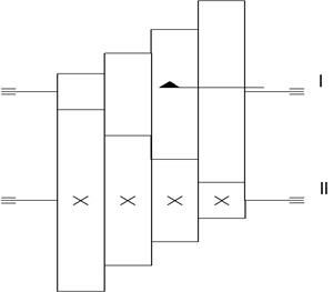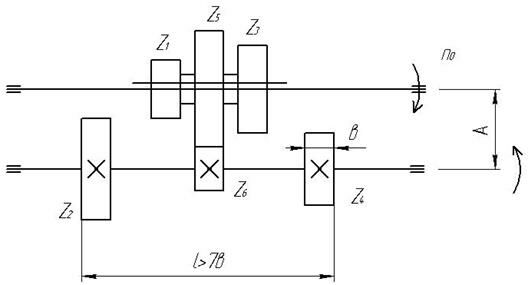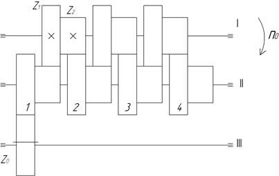 На валу Ι подвижно закреплён трехвенцовый блок (Z1 –Z3 –Z5). На валу Ι Ι неподвижно закреплены 3 шестерни: Z2, Z4, Z6.