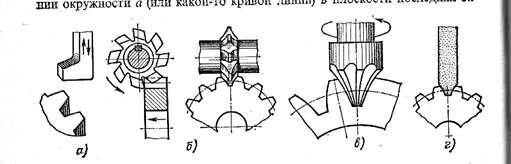 Метод копирования. Нарезание по методу копирования осуществляется фрезерованием, строганием, шлифованием и протягиванием. Инструментами при этом могут быть строгальный резец (рис. 1,а), модульные дисковая (рис. 1,б) и пальцевая (рис. 1,в) фрезы и фасонный шлифовальный круг (рис 1,г). Инструмент вырезает на заготовке впадины между зубьями, при этом профиль зуба соответствует профилю режущего инструмента. После обработки каждой впадины заготовку поворачивают на один зуб с помощью делительной головки.