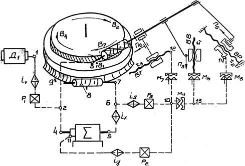 Счетно-выключающее устройство приводится в движение от вала X через кулачок К2 и рычажно-храповой механизм с регулируемым упором.