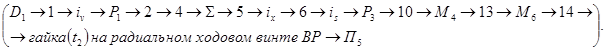Уравнение кинематического баланса для цепи ускоренного радиального перемещения подвижной стойки: