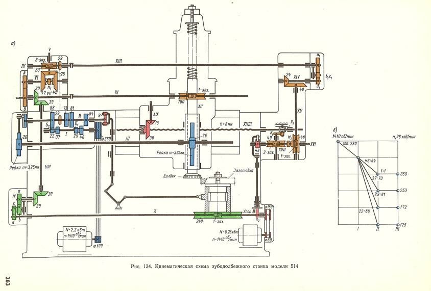 Принцип работы. Станок модели 514 работает по методу обкатки, воспроизводя зацепление двух цилиндрических колес, одно из которых является режущим инструментом (долбяком), а второе заготовкой. Долбяк закрепляется на конец шпинделя и получает прямолинейное возвратно-поступательное движение. При движении вниз долбяк совершает рабочий ход, снимая стружку с заготовки. Обратный ход долбяка является холостым; в это время стол с заготовкой отводится на небольшое расстояние от долбяка.