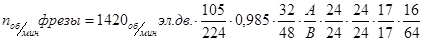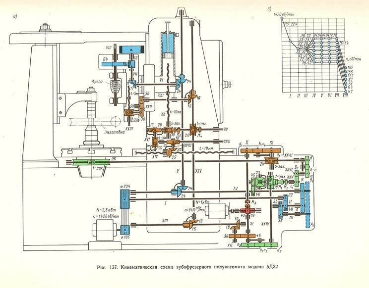 Вращение от фрезы передается столу с заготовкой через колеса 64 – 16, вал VII, конические колеса 17 – 17, вал VI, конические колеса 24 – 24, вал V, конические колеса 24 – 24, вал IV, винтовые колеса 46 – 46, центральные конические колеса дифференциала, вал XXV, колеса С1 – D1 гитары переключения, колеса a – b – c – d гитары обкатки (деления), вал XXVII и червячную передачу 1 – 96.