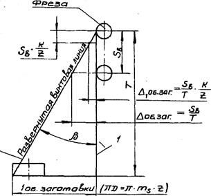 При перемещении фрезерного суппорта в вертикальном направлении на шаг винтовой линии нарезаемого колеса, заготовка сделает +/- 1 дополнительный оборот.