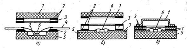 Корпуса ИМС, в которых пайкой стеклом выполняется монтаж кристалла, присоединение выводов и- герметизация (д), изоляция проводящих слоев и герметизация (б), изоляция токоведущих дорожек и герметизация (в):