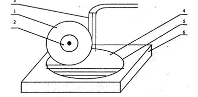 На рисунке  показана схема резки полупроводниковой пластины диском с наружной алмазной режущей кромкой. Диск 1 устанавливается на шпинделе станка и зажимается с двух сторон фланцами 2. В процессе резания алмазный режущий диск вращается с большой скоростью и охлаждается жидкостью 3. Разрезаемую полупроводниковую пластину 4 закрепляют клеящей мастикой 5 на основание 6.