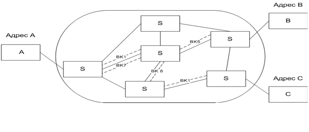 Ядро сети состоит из коммутаторов пакетов поддерживающих 2 таблицы – таблица маршрутизации и таблица коммутации. Первая используется для установления виртуальных каналов, вторая для коммутации пакетов по номерам BK.